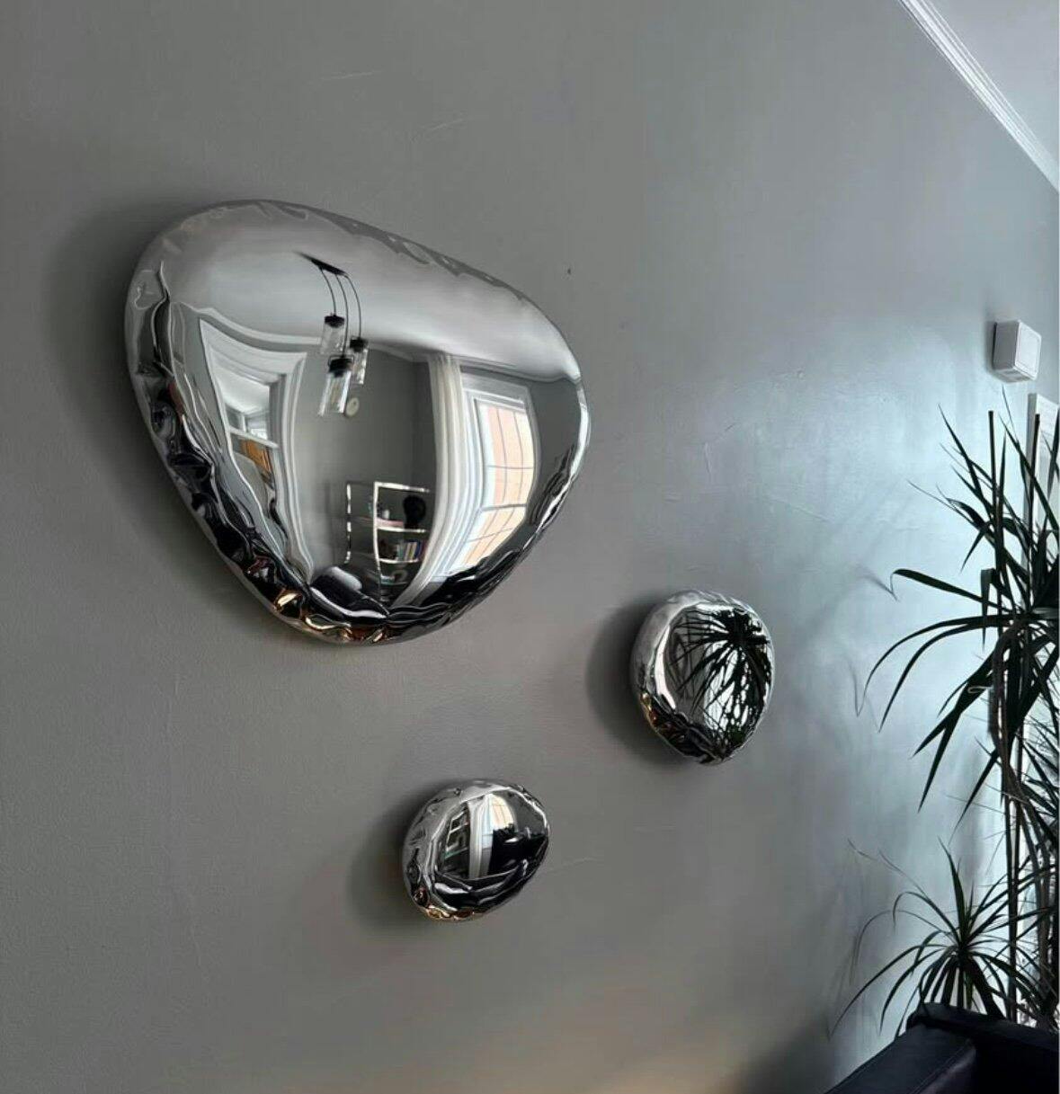 Chrome Bubbles is a 3-piece wall art set crafted from high-polish stainless steel, designed to resemble liquid metal captured mid-motion. Each piece has an organic, irregular shape—like reflective bubbles drifting across the wall. The smooth, mirrored surface interacts dynamically with its surroundings, bouncing light and reflections in unexpected ways. Bold yet minimal, Chrome Bubbles adds a sculptural, futuristic edge to any modern space.