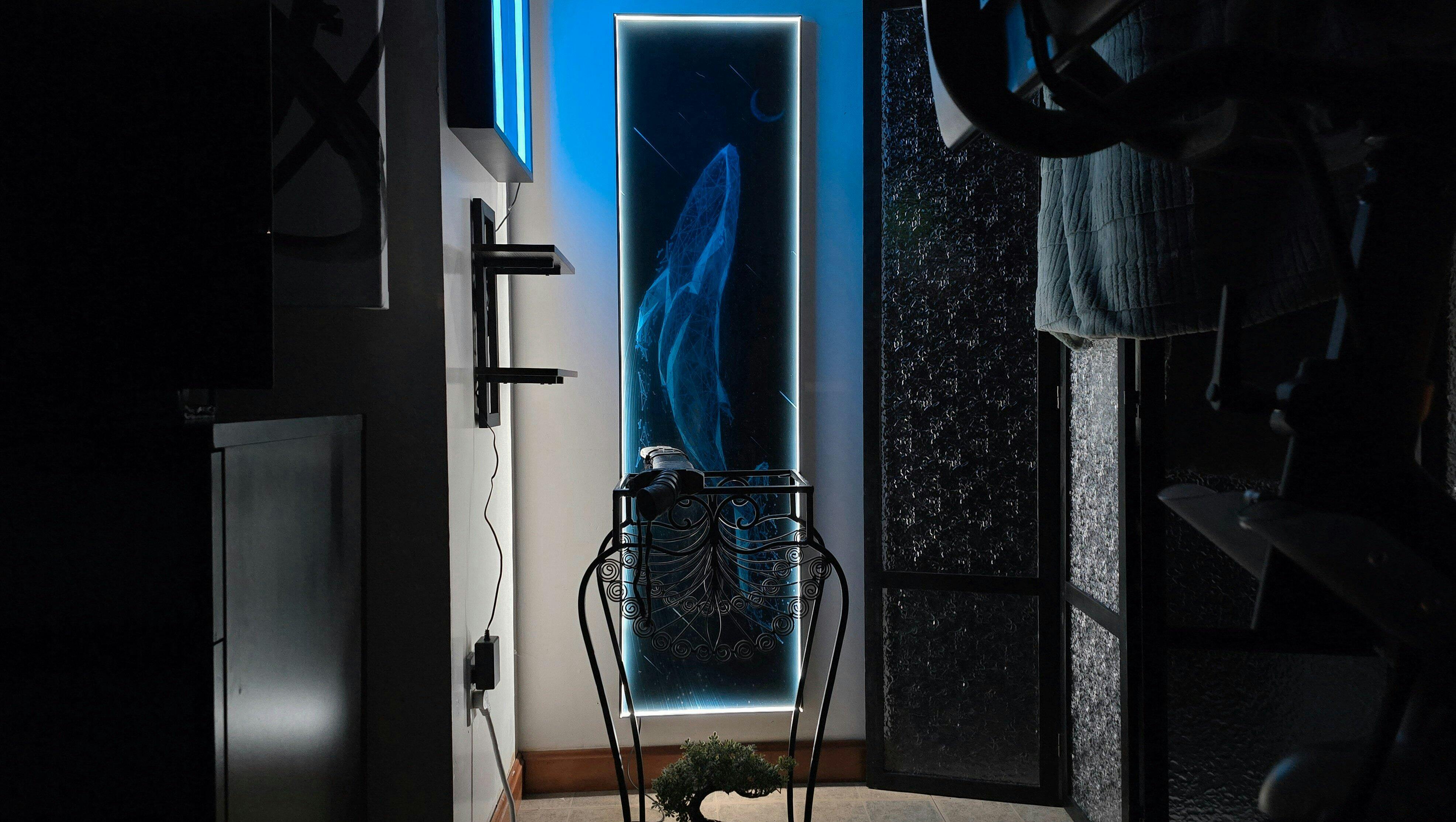 Introducing "Deep Ocean Glow: LED-Lit Dark Blue Whale Art" - a captivating depiction of a majestic whale illuminated in dark blue LED light against a black background, evoking the mysterious depths of the ocean. This mesmerizing piece transports viewers to the serene world of the deep sea, where the gentle glow of the whale illuminates the darkness, casting a spellbinding aura of tranquility. With its dynamic portrayal and luminous presence, "Deep Ocean Glow" adds a touch of underwater magic to any space, inviting viewers to embark on a journey of exploration and wonder. Elevate your home decor with the enchanting allure of this LED-lit masterpiece and let its deep-sea beauty transform your surroundings into a sanctuary of serenity.