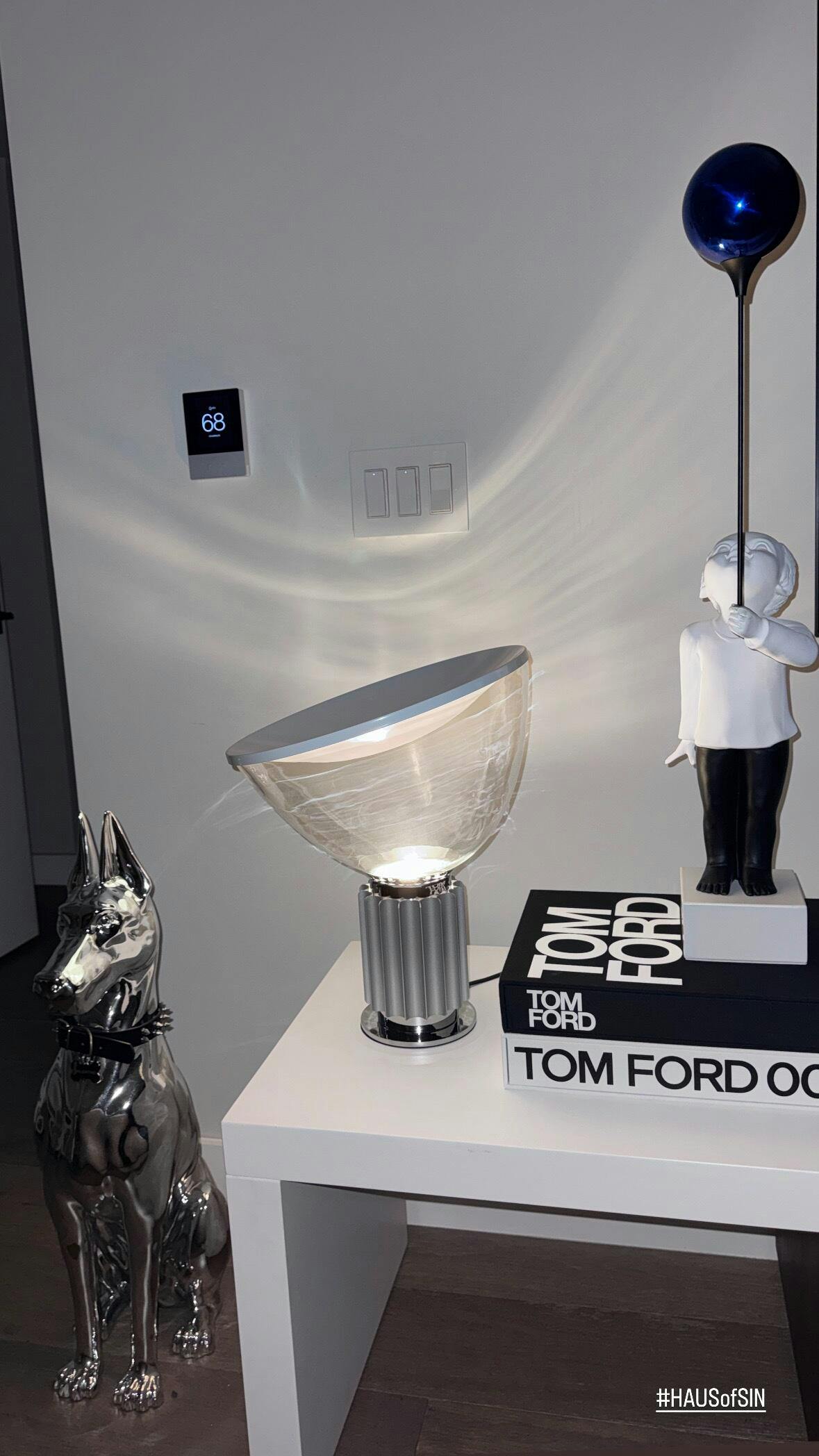 The Taccia Table Lamp is an iconic masterpiece that showcases its minimalist ethos, with a unique parabolic shape and a hand-blown glass diffuser that offers ambient, non-dazzling light, perfect for sophisticated spaces. Its aluminum chrome reflector, gloss white on the inside and matte white on the outside, enhances light diffusion while adding a sleek touch. The cylindrical base, available in anodized silver aluminum, evokes the elegance of a Doric column. Combining energy efficiency with an artistic legacy, the Taccia Style Table Lamp is a standout piece for luxury interiors.